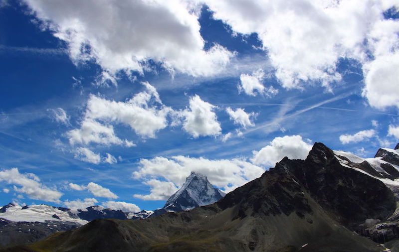 山小屋を超えると一気に視界が開けてきます。なだらかな場所もあり、ルートの途中から後ろを振り返るとマッターホルンが遠くに見えました。